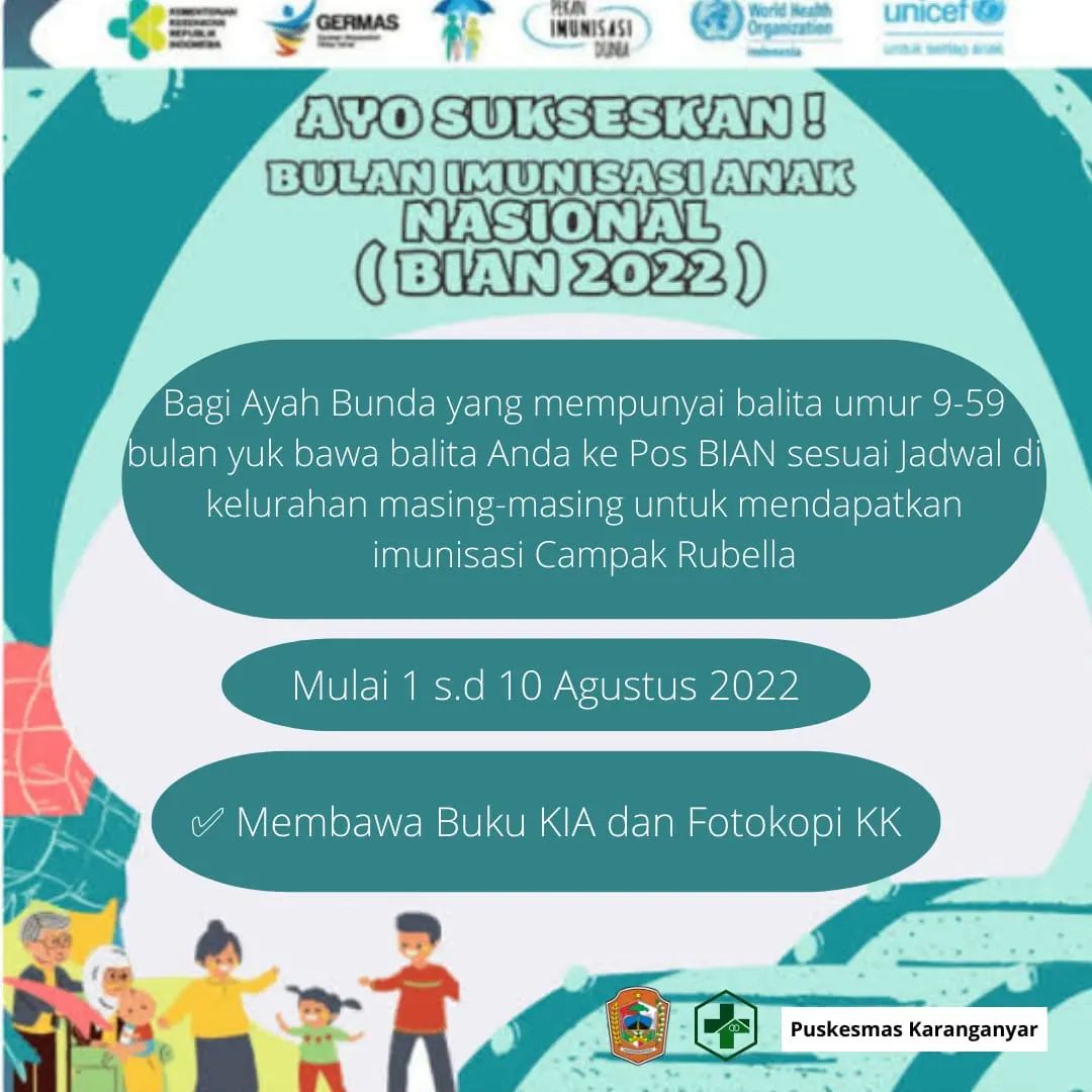 Bagi Ayah Bunda di wilayah Kecamatan Karanganyar yang memiliki balita usia 9-59 bulan yuk bawa balitanya ke Pos BIAN sesuai jadwal di Kelurahan masing-masing untuk mendapatkan imunisasi Campak Rubella mulai tanggal 1 s .d 10 Agustus 2022..Jangan lupa bawa Buku KIA dan fotokopi KK.
