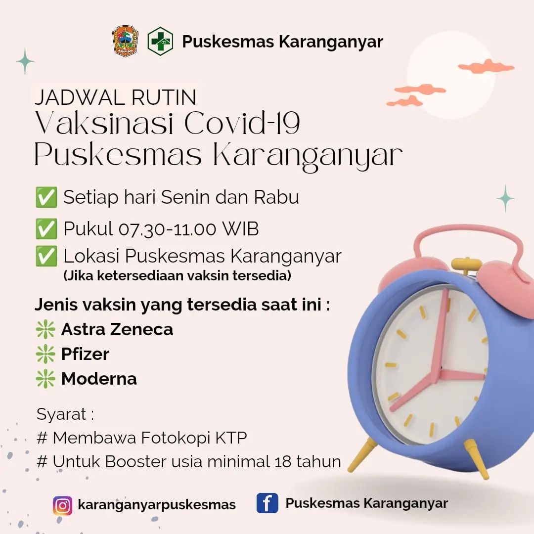 Yang masih butuh Vaksinasi Covid-19 baik Dosis 1, 2 atau booster kami siap melayani kembali mulai besok Rabu tanggal 20 Juli 2022 di Puskesmas Karanganyar jam 07.30-11.00 WIB.