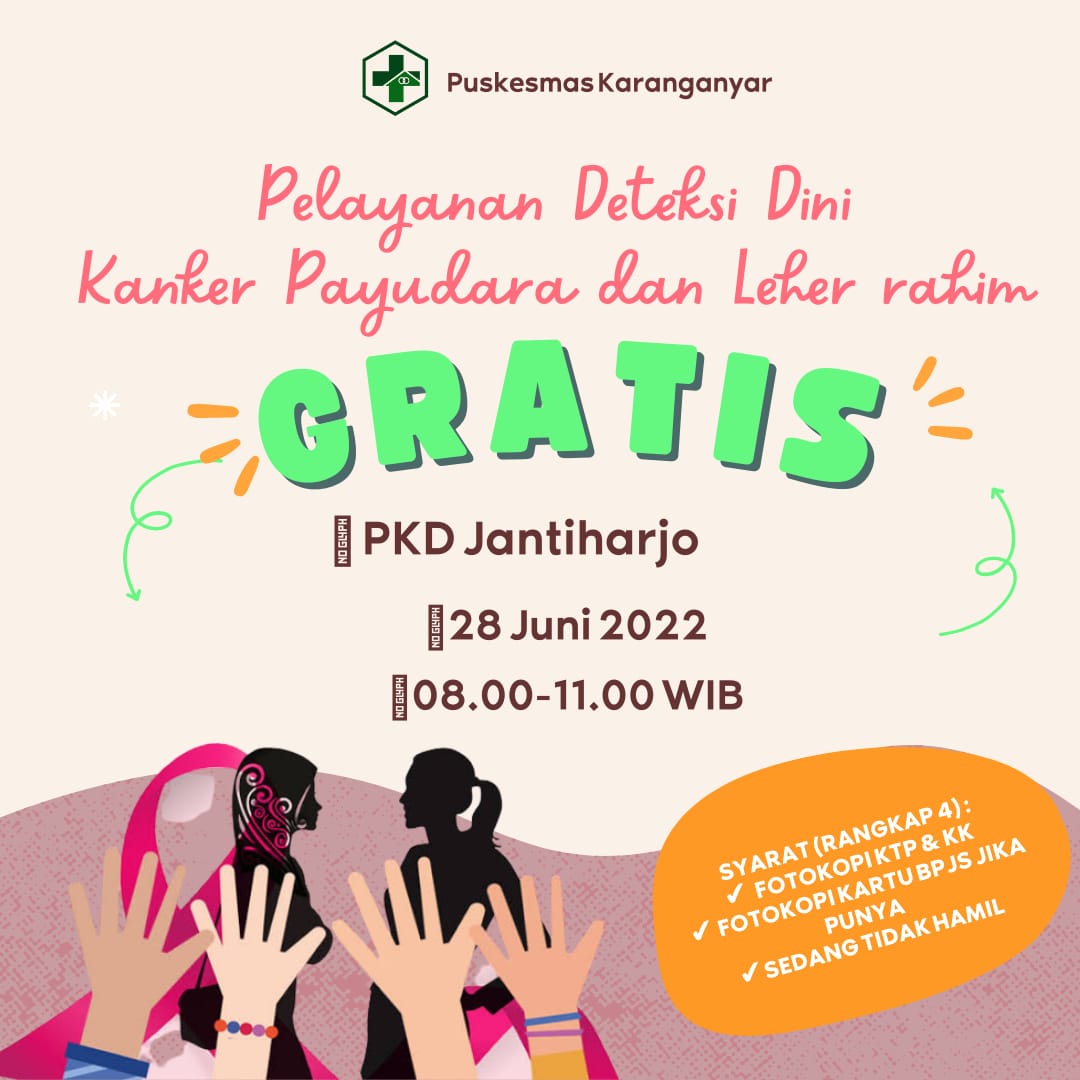 Kegiatan Pelayanan Deteksi Dini Kanker Payudara dan Leher Rahim dengan Metode IVA di Kelurahan Jantiharjo..Kegiatan ini bertujuan untuk mendeteksi Kanker Payudara dan Leher Rahim yang bisa dilaksanakan pada wanita yang sudah melaksanakan hubungan seksual, sedang tidak hamil dan sedang tidak datang bulan atau menstruasi..Ayo cek dari sekarang, mau tunggu apa lagi…